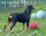 Big dogs can run in a large grassy fenced yard with tug toys and balls to play with. We provide a wading pool in summer and large “igloo” houses for outdoor napping. Big dogs are only socialized with other big dogs of similar size and temperament.