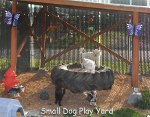 Little dogs play in a smaller social yard, with a covered area and shallow wading pool in summer.